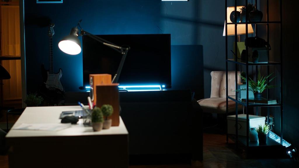 Ein schmaler Wandklapptisch schafft tagsüber Arbeitsplatz und verwandelt sich abends in eine Servierfläche. Fächer darüber beherbergen Ordner und Gläser. Zusammengeklappt verschwindet alles schlank, sodass der Boden frei bleibt und der Raum großzügiger wirkt.